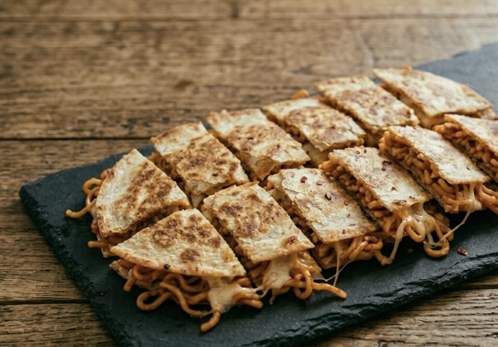Instructions: 1) Prepare the noodles normally and set them aside. 2) Lay a tortilla flat, cover half of it with cheese, and add a layer of the spicy Buldak ramen noodles. Fold the other half over. 3) Toast the folded tortilla in a dry frying pan over medium heat until both sides are golden brown and the cheese is fully melted. 4) Let it cool slightly, then cut it into 2-centimeter-wide sticks.