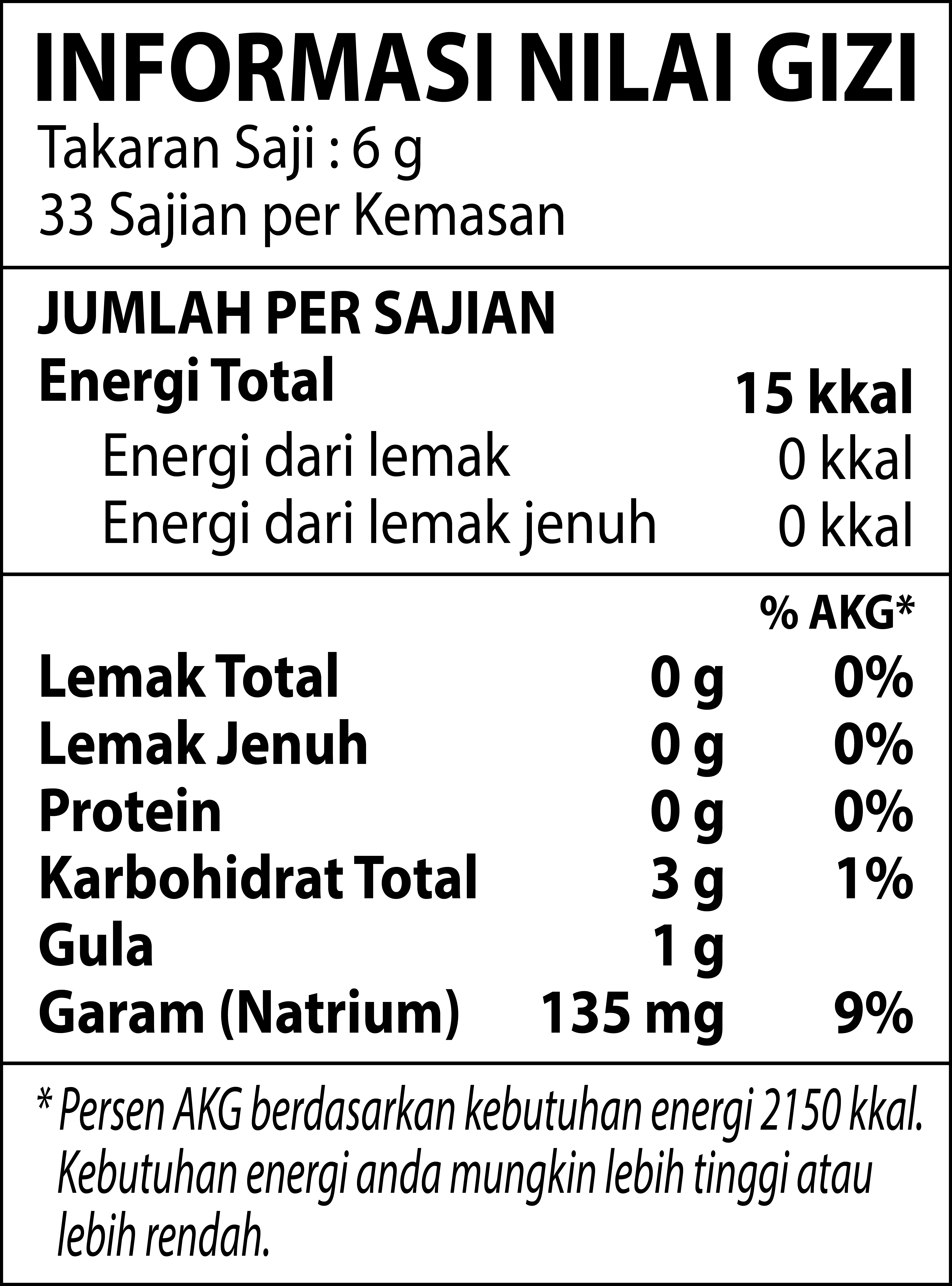Komposisi: Air, Sirup Jagung, Perisa Sintetik Ayam (Mengandung Penguat Rasa Dinatrium 5' Ribonukleotida, Mononatrium L-Glutamat, Antioksidan Tokoferol), Saus Kedelai (Mengandung Penguat Rasa Dinatrium 5'- Ribonukelutida, Pemanis Alami Glikosida Steviol), Gula, Minyak Kedelai, Bumbu Rasa Cabai, Ekstrak Ragi, Bawang Bombay, Bumbu Rasa Habanero (Mengandung Kedelai, Penguat Rasa Natrium 5' Inosinat dan Guanilat, Cabai Habanero), Pati, Bawang Putih, Ekstrak Cabai, Perisa Sintetik Ayam (Mengandung Penguat Rasa Dinatrium 5' Ribonukleotida), Cabai, Perisa Alami Paprika, Pengatur Keasaman, Lada Hitam, Perisa Sintetik Kari (Mengandung Penguat Rasa Dinatrium 5' Ribonukleotida), Perisal Alami, Ekstrak Ragi, Perisa Alami Teh Hijau, Xanthan Gum.