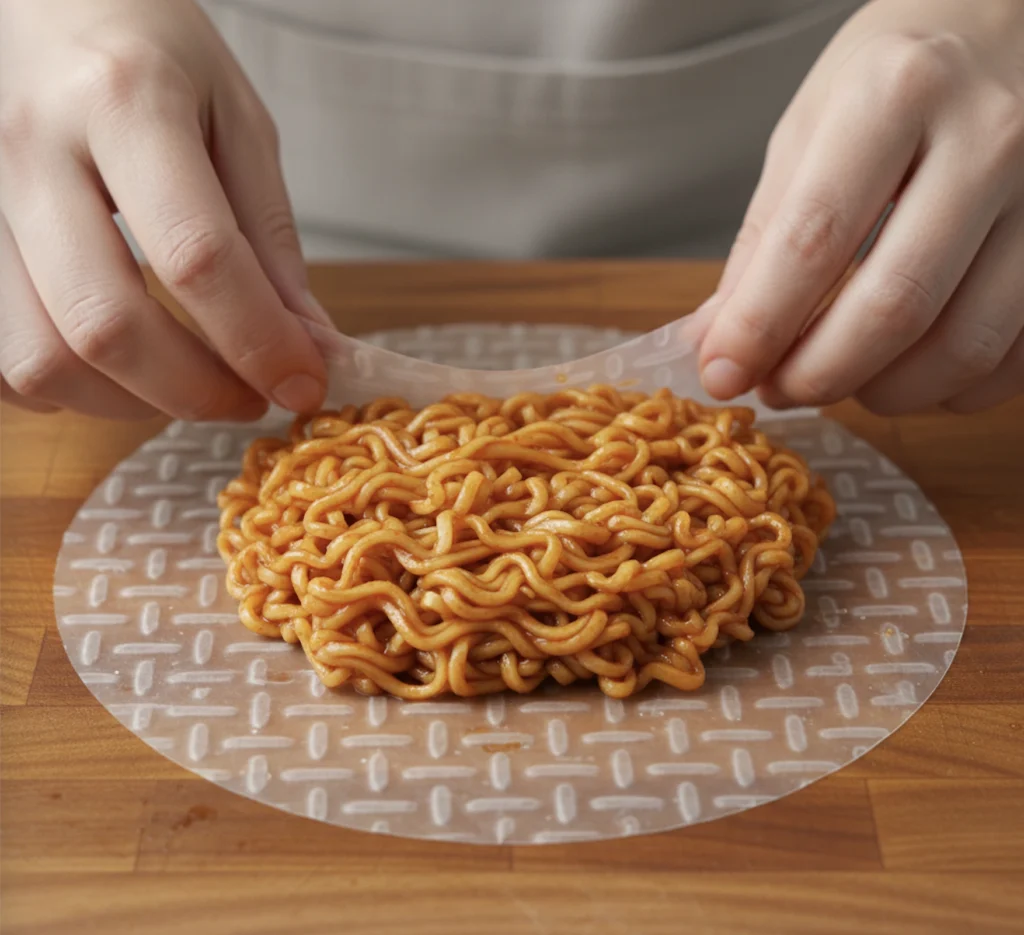 라이스 페이퍼 중앙에 불닭 볶음면을 소량 올려주세요.(너무 많이 올리면 찢어지니 주의해주세요!) 취향에 따라 치즈나 다진 파를 함께 올려도 잘 어울립니다.