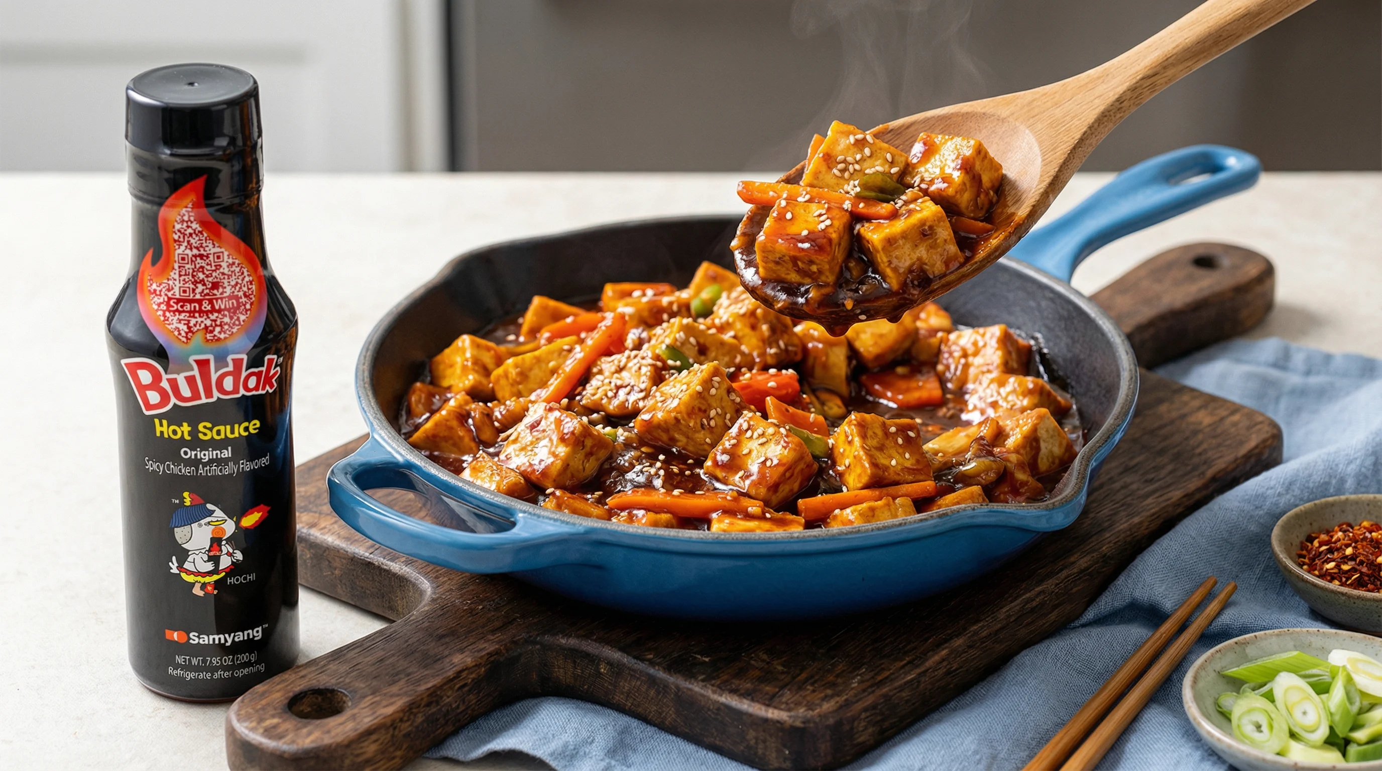Buldak sauce stands out in one-pan cooking because it works with beef, shrimp, tofu, and more, bringing real ingredients together fast with real flavor.