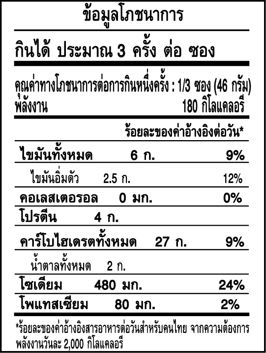 ข้อมูลสำหรับผู้แพ้อาหาร : มีแป้งสาลี ผลิตภัณฑ์จากถั่วเหลือง ผลิตภัณฑ์จากนม และอาจมีน้ำมันถั่ว สัตว์น้ำที่มีเปลือกแข็ง ไข่ ปลา หอย ปลาหมึก มัสตาร์ด ถั่วต่างๆ อัลมอนด์ เมล็ดงา สำหรับผู้ที่ต้องจำกัดการบริโภคไอโอดีน