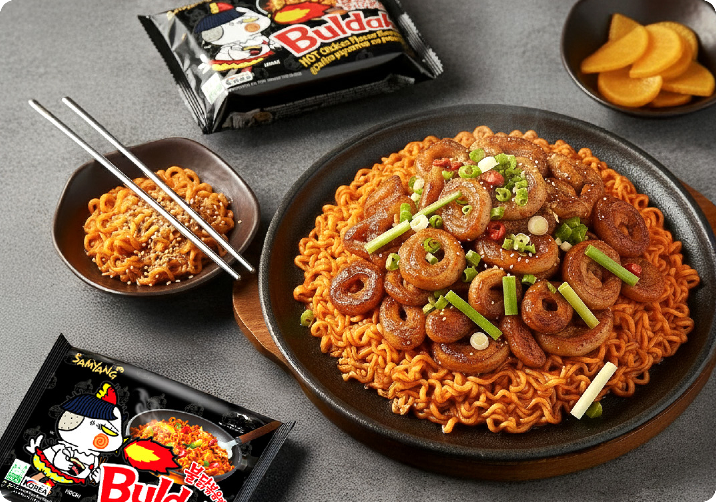 A trending fusion pairing rich, crispy-soft gopchang or daechang with fiery Buldak flavor. The bold fat-meets-heat combo taking over social feeds for its intense, addictive taste.