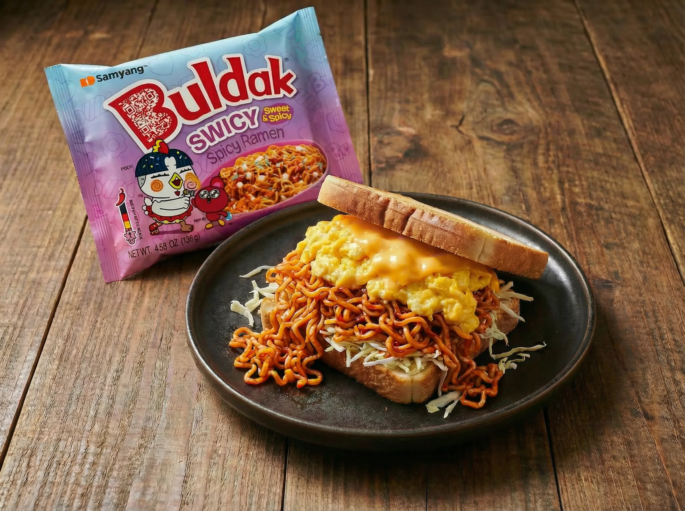 Recipe 1: Swicy Egg & Cheese Toast: This creates a carb-on-carb delight where the spicy noodles act as a rich filling.