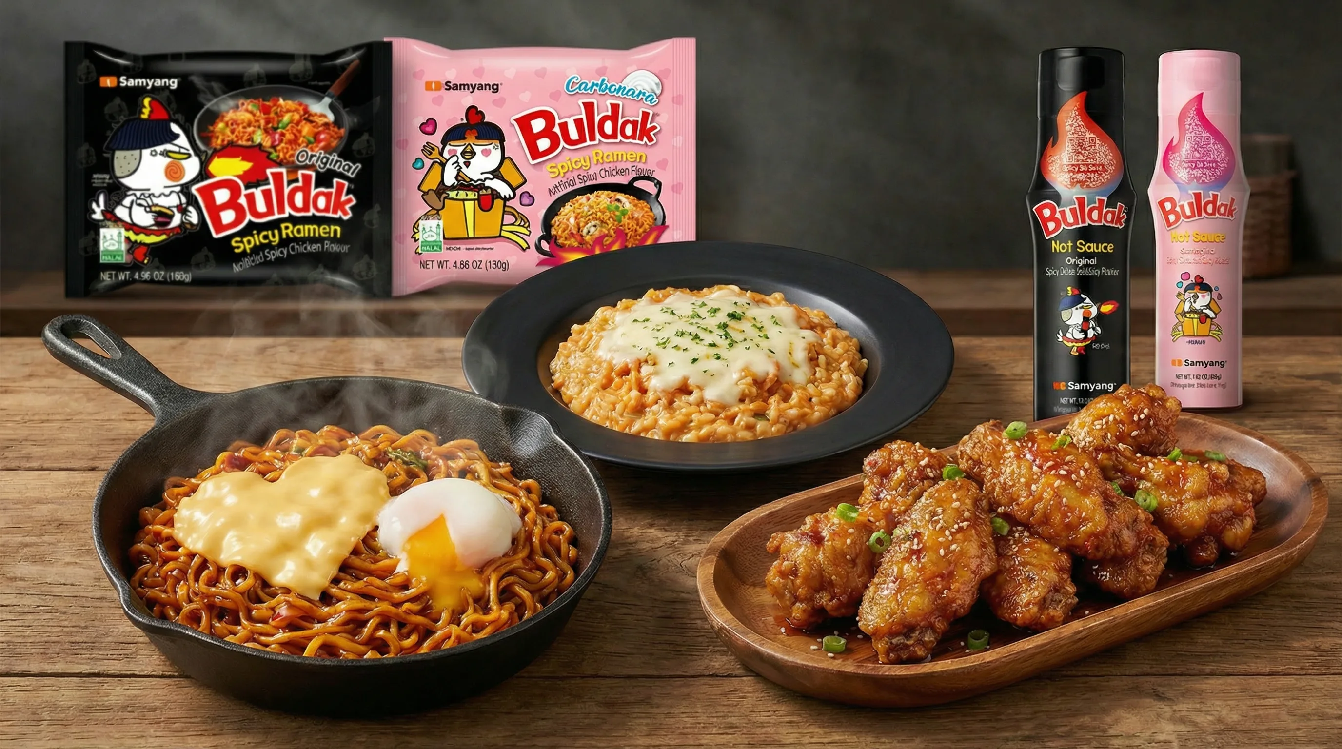 2–3 Buldak products (include 'Buldak Ramen Cheese').