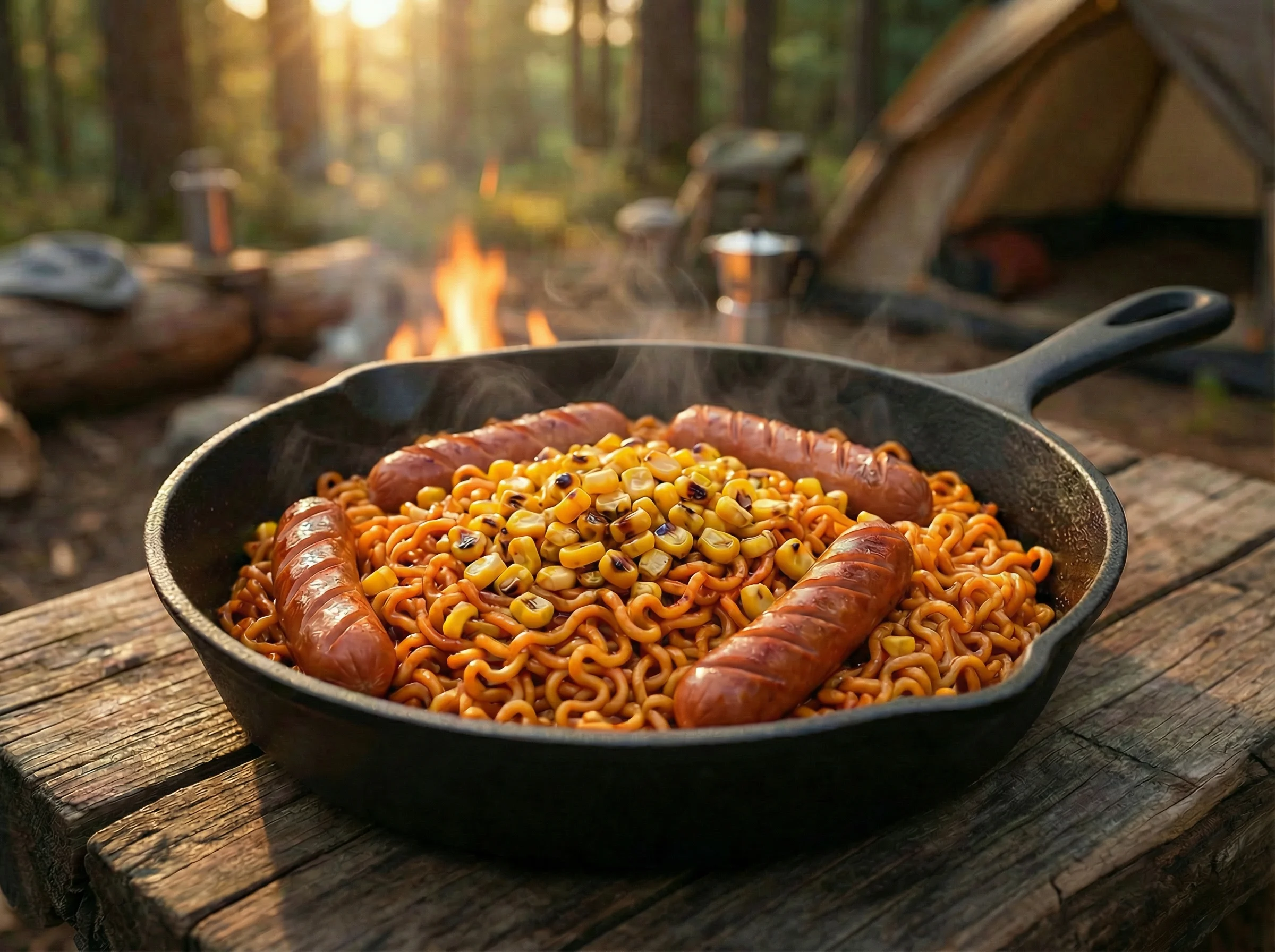 Cooking over an open flame with a cast-iron skillet is a timeless outdoor tradition. By combining smoky sausages, sweet corn, and a generous layer of melted cheese with the fiery kick of the noodles, you create a rustic, deeply satisfying feast. This is one of the most popular camp meals for group trips.